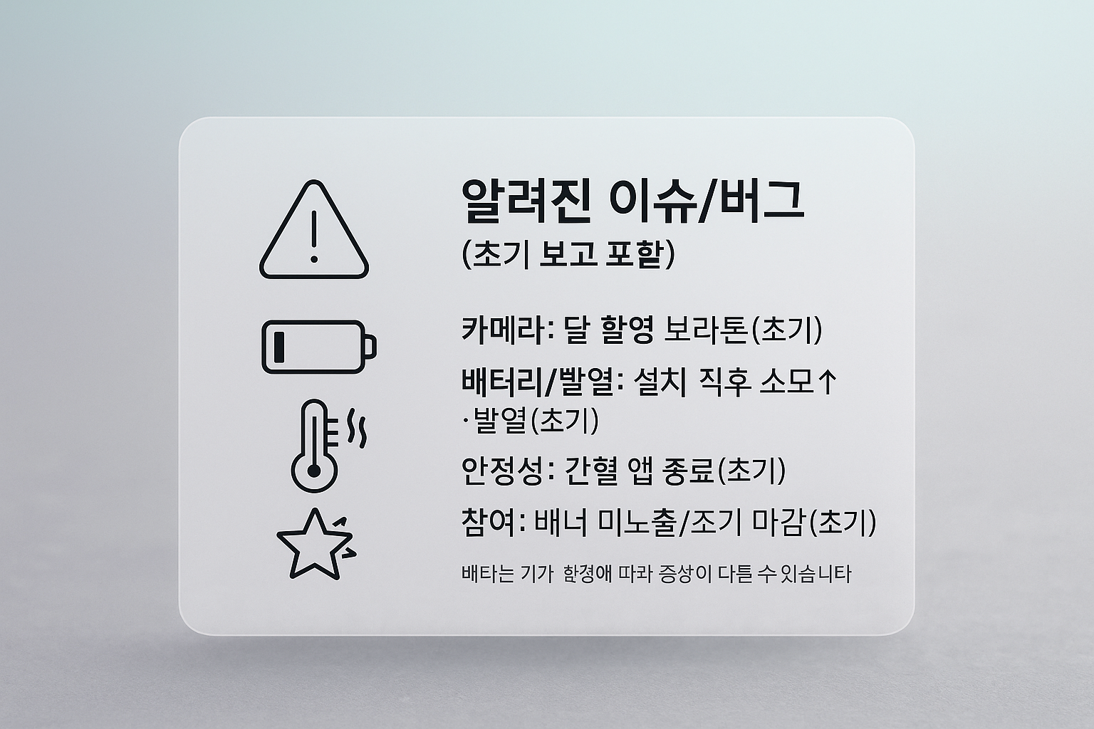 • 배터리/발열: 베타 설치 직후 소모 증가·발열 보고 (초기 보고)